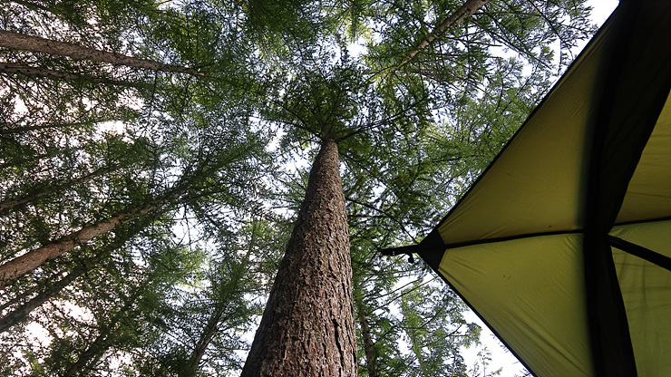 텐트 인근의 키큰 나무에 조금씩 햇살이 가라앉는다