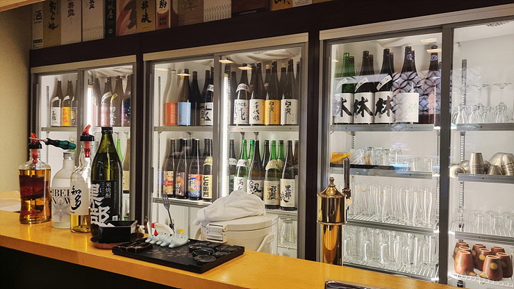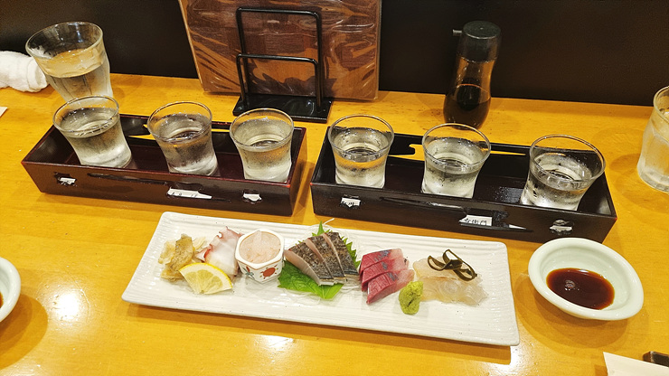 우리는 사케 맛보기 세트 2가지를 주문했고