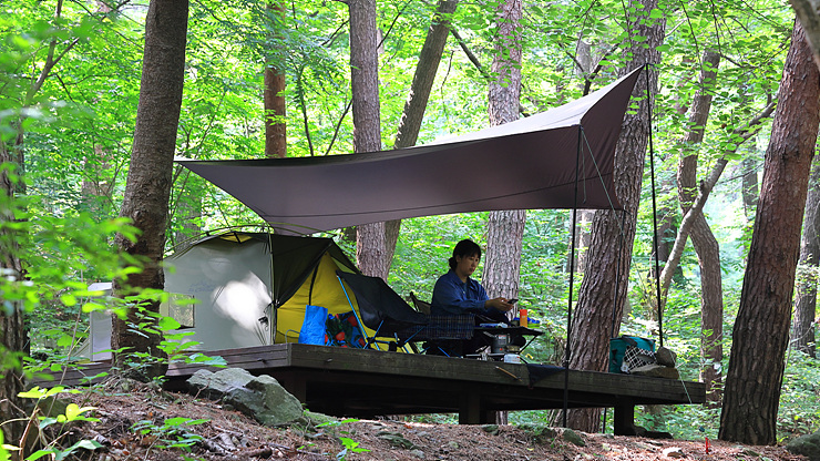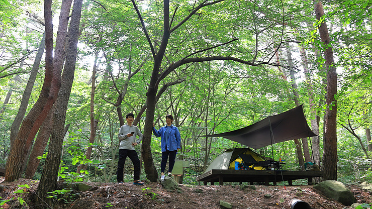 나무와 타프로 만들어진 그늘 아래서