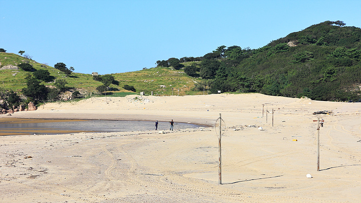페 전봇대와 초소가 있는 모래 해변길을 다시 건너온다..